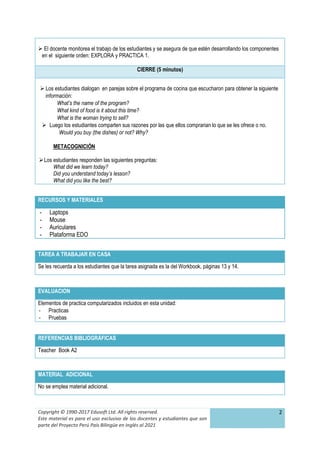 Este documento presenta una sesión de aprendizaje de inglés sobre alimentación saludable para estudiantes de nivel A2. La sesión se centra en el vocabulario relacionado con la cocina y en escuchar un programa de radio sobre comida. Los estudiantes aprenderán vocabulario nuevo en la plataforma EDO y luego dialogarán en parejas sobre el programa de radio que escucharon.