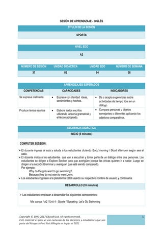 Este documento presenta la planificación de una sesión de aprendizaje de inglés sobre deportes para estudiantes de nivel A2. La sesión se centra en enseñar comparativos de igualdad y desarrollo de habilidades de expresión oral a través de un diálogo. Los estudiantes usarán la plataforma EDO para completar actividades interactivas sobre vocabulario y gramática relacionados con los deportes. Al final, reflexionarán sobre lo aprendido y recibirán una tarea para realizar en casa.