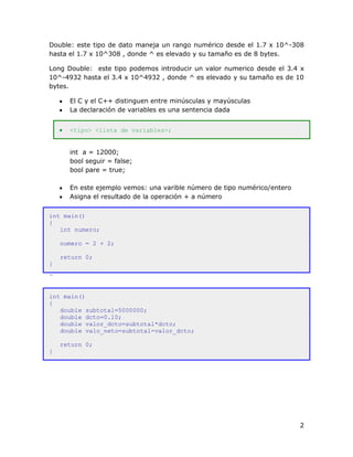 1) El documento describe las partes básicas del lenguaje C++ como la declaración de variables, los tipos de datos y las reglas para los nombres de variables. 2) Explica los diferentes tipos de datos primitivos como char, int, float y double y sus rangos de valores. 3) Detalla otras reglas como el ámbito de las variables y cómo pueden ser accesibles desde diferentes partes del código.