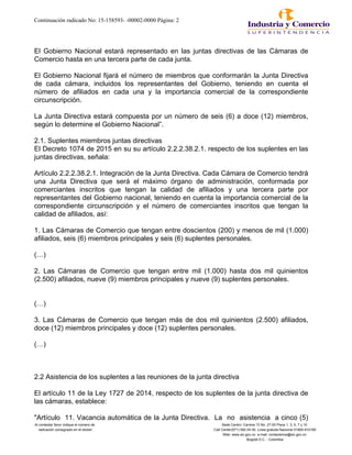 Este documento responde una consulta sobre las funciones de los miembros suplentes en las juntas directivas de las cámaras de comercio. Explica que los suplentes reemplazan a los principales en sus ausencias temporales o definitivas en las reuniones ordinarias o extraordinarias. También indica que los estatutos de cada cámara definen la participación de principales y suplentes en las reuniones.