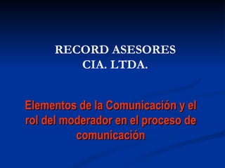 El documento presenta información sobre elementos de la comunicación, el rol del facilitador en el proceso de comunicación, técnicas de manejo de grupos y técnicas de visualización. Define los elementos básicos de la comunicación como emisor, receptor y mensaje. Explica las funciones del facilitador como organizar reuniones, manejar la dinámica grupal y aplicar técnicas para lograr consenso. También describe técnicas como el establecimiento de reglas, retroalimentación y manejo de conflictos para dirigir grupos de manera efectiva.