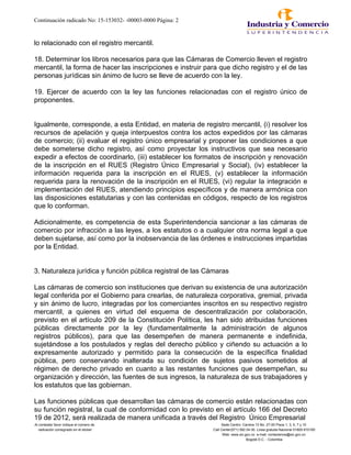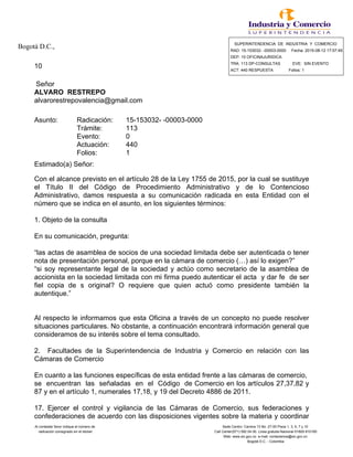 Este documento responde a una consulta sobre si las actas de asamblea de socios de una sociedad limitada deben ser autenticadas o tener nota de presentación personal ante la cámara de comercio. Explica que las cámaras de comercio tienen funciones públicas relacionadas con el registro mercantil y que, aunque son entidades privadas, deben ceñirse a las normas públicas. Finalmente, indica que el decreto antitrámites eliminó el requisito de autenticación de documentos, salvo para actas de personas jurídicas