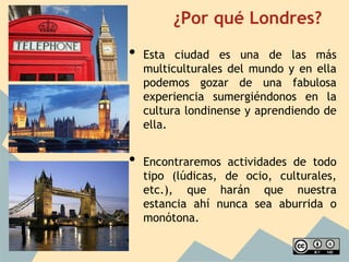 Este documento proporciona información sobre lugares para visitar en Londres. Recomienda que Londres es una ciudad multicultural con muchas actividades culturales y de ocio. Algunos de los lugares más populares para visitar son la Torre de Londres, la noria London Eye y el Palacio de Buckingham. También recomienda obtener una tarjeta London Pass para acceder a múltiples atracciones. El documento incluye enlaces a guías y mapas de la ciudad para ayudar a los turistas a planificar y disfrutar de su viaje.