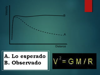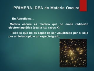La materia oscura se refiere a materia que no emite radiación electromagnética y solo puede ser detectada por sus efectos gravitacionales. En 1933, Fritz Zwicky observó que las velocidades de las galaxias en cúmulos indicaban la presencia de más masa de la que se podía ver, dando origen al término "materia oscura". Estudios posteriores han encontrado que alrededor del 90% de la masa de las galaxias y cúmulos de galaxias parece ser materia oscura. La detección de materia oscura