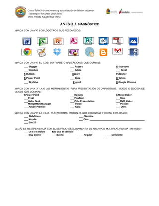 El documento presenta un diagnóstico sobre las habilidades tecnológicas y herramientas digitales de un docente. El docente marca con una X sus conocimientos sobre plataformas como Facebook, Word, Power Point y Gmail, así como sus experiencias con servicios en la nube y plataformas virtuales como Moodle y SlideShare.