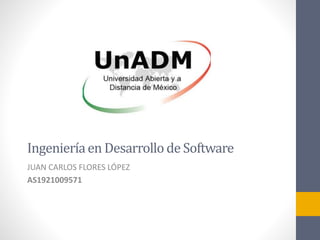 El documento describe un programa de ingeniería en desarrollo de software de la UnADM. El programa dura 8 semestres y cubre temas como lenguajes de programación, bases de datos, ingeniería de software, matemáticas y administración de proyectos. Los egresados estarán capacitados para trabajar en el desarrollo de software, auditorías, administración de bases de datos y más. El campo laboral incluye puestos en banca, industria, gobierno y más. El programa busca aumentar las capacidades intelectuales en México para imp