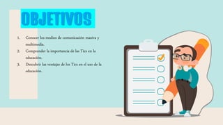 El documento analiza la importancia y las ventajas de las Tecnologías de la Información y la Comunicación (TIC) en la educación, destacando su papel en el acceso y manipulación de la información, así como en la mejora de la comunicación y el aprendizaje de estudiantes y docentes. Se enfatiza que los medios como la televisión, la radio, las computadoras, internet y teléfonos móviles ofrecen diversas oportunidades educativas, permitiendo un aprendizaje más personalizado y flexible. Finalmente, se señala que las TIC actuales son más dinámicas y accesibles, favoreciendo un aprendizaje continuo y colaborativo en el aula invertida.