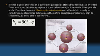 El documento describe el movimiento del Sol y la variación de la duración del día y la noche en diferentes latitudes a lo largo del año. Explica que en el equinoccio de otoño el día y la noche tienen la misma duración, mientras que en el solsticio de invierno el día es más corto y la noche más larga. También define los conceptos de día, año y formas de medir el tiempo basadas en el movimiento de la Tierra.