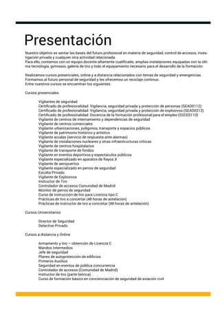 Este documento presenta la Academia COSFORMACION, la cual ofrece una amplia gama de cursos de seguridad privada presenciales y online. Entre los cursos se incluyen Vigilante de Seguridad, Vigilante de Explosivos, Escolta Privado, y especializaciones como Vigilante de Centros Comerciales y Vigilante de Patrimonio Histórico y Artístico. La academia cuenta con instalaciones equipadas, como una galería de tiro y gimnasio, y ofrece titulaciones homologadas por el Ministerio del Interior.