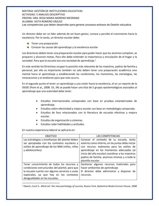 Las competencias que debe desarrollar un director escolar incluyen: 1) tener una preparación académica y mental para entender las causas del aprendizaje y la excelencia, 2) conocer el contexto interno y externo de la escuela para establecer estrategias de enseñanza apropiadas, y 3) gestionar recursos y motivar al personal docente para crear ambientes de aprendizaje que apoyen la visión y misión de la institución educativa.