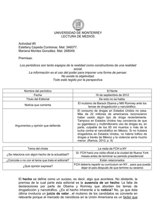 El editorial critica el mutismo de Obama y Romney sobre temas de drogadicción y narcotráfico. Argumenta que el uso de drogas en EEUU es parcialmente responsable de la violencia en México. El chiste sugiere que Calderón debería buscar trabajo en Nueva York después de dejar la presidencia.
