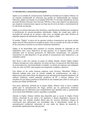El documento describe el estándar Zigbee para redes inalámbricas de baja potencia. Zigbee se basa en el estándar IEEE 802.15.4 y permite la creación de redes mesh autoorganizadas con tres tipos de dispositivos (coordinador, router y dispositivo final). El estándar define la arquitectura de red, capas, topologías, modulaciones y funcionalidad para aplicaciones de bajo consumo como domótica e industria.
