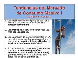 El documento presenta 12 tendencias del mercado de consumo masivo en América Latina. Estas incluyen que las experiencias de compra y uso serán más importantes, los productos serán más especializados, y las estrategias de las multinacionales se centrarán en el canal tradicional. Además, los consumidores asumirán un modelo de portafolio combinado, buscarán cuidarse a través de sus hábitos de consumo, e identificarse con nichos a través de sus hábitos. Finalmente, aumentarán los matrimonios jó