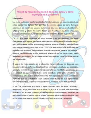 Este documento describe cómo las redes sociales como WhatsApp, Facebook, Instagram, YouTube y Pinterest pueden usarse como herramientas educativas. Explica que estas plataformas permiten la comunicación y colaboración entre estudiantes y profesores, compartir material educativo como videos e imágenes, y promover la creatividad y participación de los estudiantes. Además, detalla algunos ejemplos específicos de cómo estas redes sociales se pueden implementar en el aula para enriquecer el aprendizaje.
