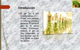El documento describe la investigación del Dr. Gaxiola sobre el gen H+-PPasa, el cual juega un papel fundamental en el transporte de azúcar en las plantas. Gaxiola extrae este gen conservado de la planta Arabidopsis thaliana e incrementa su expresión en otras plantas mediante ingeniería genética. Esto resulta en plantas transgénicas con sistemas radiculares más robustos y una mayor capacidad de absorción de agua y nutrientes.