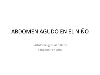 Este documento habla sobre el abdomen agudo en niños y cubre temas como la hipertrofia pilórica, la atresia duodenal y la obstrucción intestinal. Explica que en recién nacidos las causas comunes de abdomen agudo son malformaciones congénitas que obstruyen el intestino, mientras que en lactantes pueden ser una hernia inguinal estrangulada, hipertrofia del píloro o invaginación intestinal. También ofrece detalles sobre el cuadro clínico, diagnóstico y tratamiento de la obstrucción