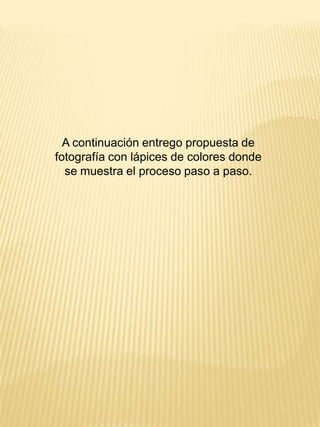 El documento propone utilizar lápices de colores para ilustrar una fotografía, mostrando el proceso paso a paso. Se presenta la técnica de ilustración con lápices de colores y se agradece al tutor por la oportunidad.