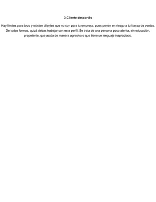 El documento proporciona instrucciones para una actividad de aprendizaje en la que los estudiantes deben identificar diferentes tipos de clientes y describir cómo abordar a cada tipo. Se pide que se presenten al menos tres casos de clientes y se identifique el tipo de cliente en cada caso junto con la mejor y peor forma de interactuar con ese tipo de cliente.
