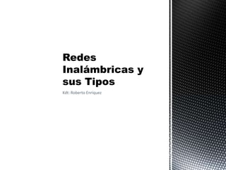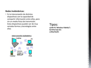 Este documento describe diferentes tipos de redes inalámbricas, incluyendo Wi-Fi, infrarrojo, Bluetooth y microondas. Wi-Fi permite la transmisión inalámbrica de datos a corta distancia de hasta 100 metros. La tecnología infrarroja transmite datos a menos de un metro usando ondas de calor. Bluetooth transmite datos de forma inalámbrica a distancias de 1 a 100 metros dependiendo de la versión. Las redes de microondas pueden ser satelitales o terrestres para comunicaciones a larga distancia.