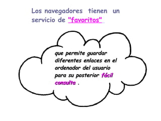 Este documento describe algunas soluciones para guardar y compartir enlaces favoritos entre diferentes ordenadores. Servicios como Diigo, Blinklist y Delicious permiten catalogar enlaces con etiquetas y marcarlos como públicos o privados, lo que posibilita localizar enlaces compartidos o mantenerlos solo accesibles para uno mismo. Estas plataformas en línea superan las limitaciones de guardar favoritos solo en un ordenador.