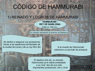 El documento resume el reinado de Hammurabi, rey de Babilonia entre 1792 a.C. y 1750 a.C., quien unificó el territorio bajo su control y promulgó el Código de Hammurabi, uno de los primeros conjuntos de leyes escritas. El Código establecía reglas sobre temas como la estratificación social, precios, responsabilidad profesional, procedimientos judiciales, escala de penas y salarios. Hammurabi creó el Código con la intención de complacer a los dioses y homogeneizar