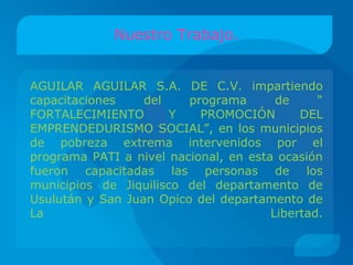 AGUILAR AGUILAR S.A. de C.V. impartió capacitaciones sobre emprendimiento social en los municipios de Jiquilisco en Usulután y San Juan Opico en La Libertad como parte del programa PATI. Las capacitaciones cubrieron temas como asociatividad y emprendimiento y utilizaron dinámicas para enseñar sobre cooperación, comunicación, confianza y trabajo en equipo. El objetivo fue ayudar al desarrollo de las comunidades y cumplir con los objetivos del programa.