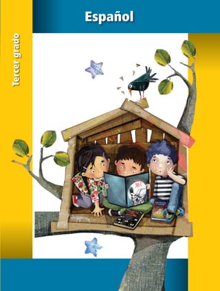 Este documento presenta un libro de texto para tercer grado de primaria en español. Incluye información sobre los autores, editores y diseñadores que participaron en su creación. Explica que el libro contiene cinco bloques con proyectos para trabajar habilidades lingüísticas como la lectura, escritura, escucha y habla. El objetivo es que los estudiantes exploren el idioma español y se enriquezcan con su poder y belleza.