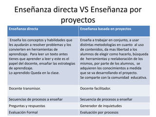El documento compara la enseñanza directa y la enseñanza basada en proyectos. La enseñanza directa se centra en enseñar conceptos y habilidades para resolver problemas, mientras que la enseñanza basada en proyectos permite a los estudiantes elegir cómo abordar un proyecto y adquirir conocimientos a medida que avanza el proyecto. La enseñanza directa evalúa de forma formal, mientras que la enseñanza basada en proyectos evalúa los procesos.