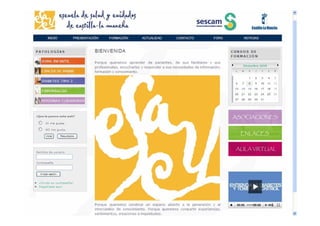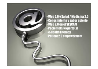 Este documento discute el concepto de "Paciente 2.0" y el uso de la Web 2.0 en el sistema de salud de Castilla-La Mancha (SESCAM). Explica cómo la Web 2.0 permite una mayor participación de los pacientes a través de herramientas como blogs y foros. También describe un foro para pacientes oncológicos en un hospital que busca mejorar la comunicación y el apoyo entre pacientes y profesionales. El documento concluye que el acceso a información a través de la Web 2.0 puede empoderar a los pacientes