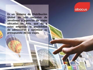 Abacus es un sistema de distribución global exclusivo para aerolíneas y agencias de viajes en Asia, creado en 1989 para optimizar la gestión de presupuestos de viaje. Sabre Holdings adquirió el 100% de Abacus por aproximadamente 411 millones de dólares, aumentando su participación del 35% inicial. El sistema ofrece soluciones tecnológicas a más de 100,000 agentes de viajes en 59 mercados de la región Asia-Pacífico, incluyendo la gestión de reservas y tarifas de aerolíneas low-cost.