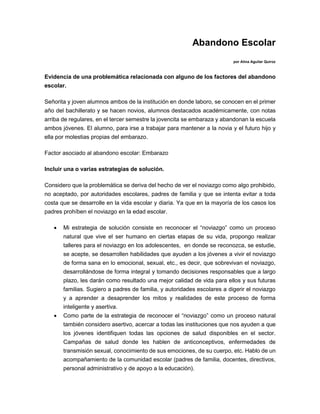 El documento describe un caso de abandono escolar debido al embarazo de una estudiante. Propone varias estrategias para abordar esta problemática, incluyendo reconocer el noviazgo adolescente como natural, ofrecer educación sobre salud reproductiva, crear foros virtuales anónimos para que los jóvenes expresen sus inquietudes, y documentar las consecuencias de decisiones incorrectas. Las estrategias se alinean con los programas "Construye T" y "Yo no abandono" al promover el desarrollo socioemocional y el a