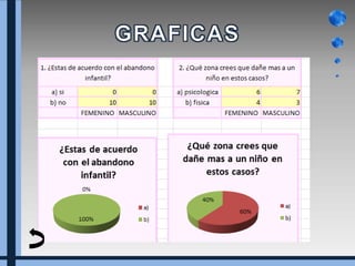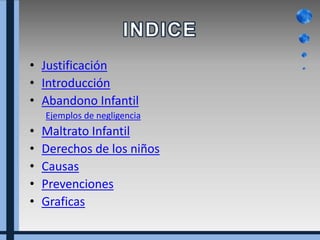 El documento trata sobre el abandono infantil. Explica que el abandono suele ser más frecuente en niños menores de 3 años debido a que son indefensos e incapaces de cuidarse a sí mismos. Define el abandono infantil como negligencia y señala que esto puede ocurrir no solo cuando se deja a un niño solo sino también dentro del hogar al rechazarlo o no proveerle de alimento, ropa o cuidados médicos. Finalmente, menciona que el abandono infantil suele tener graves consecuencias psicológicas para los niños.
