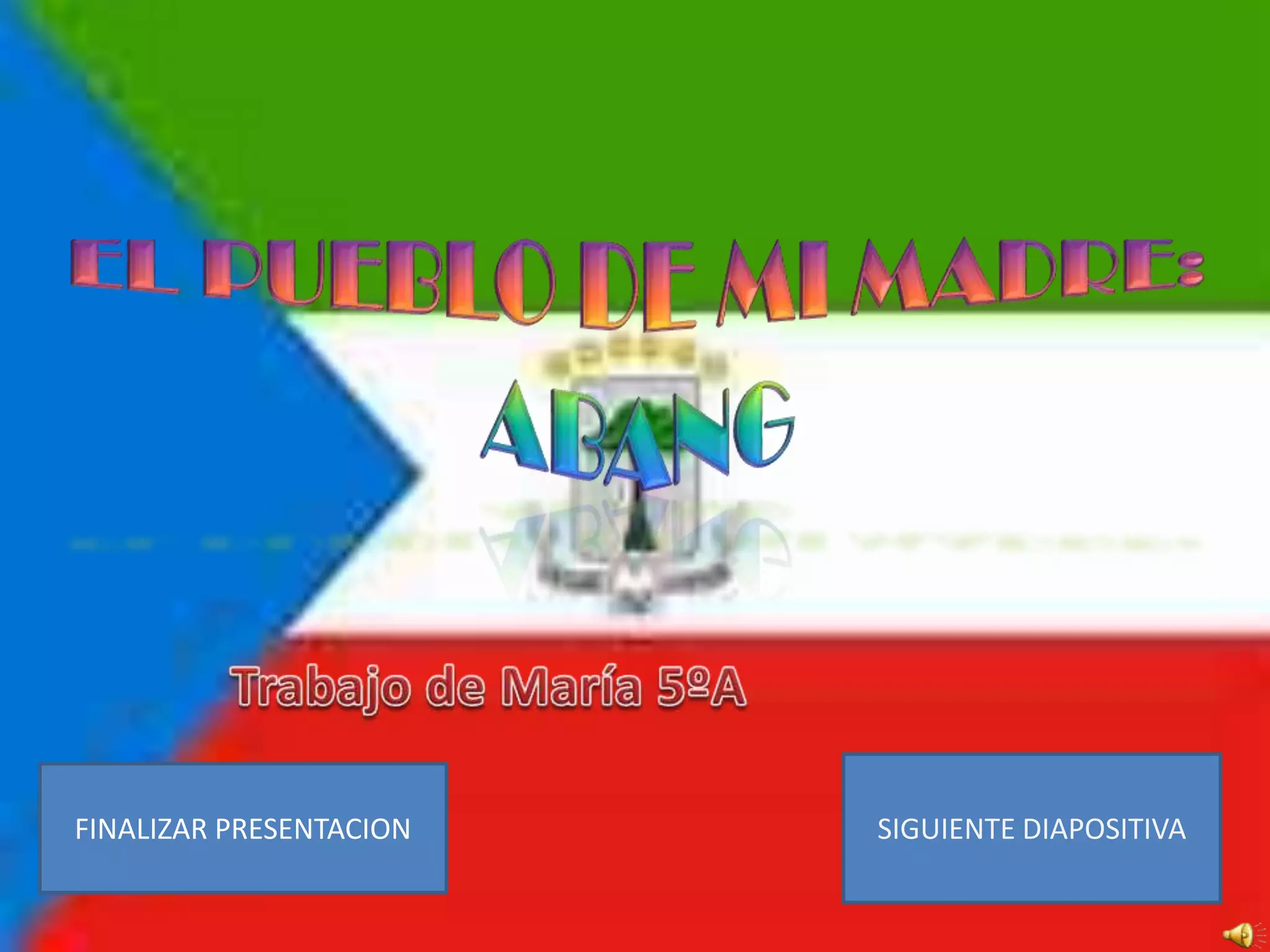 El documento presenta información sobre el pueblo de Abang en Guinea Ecuatorial, incluyendo su nombre, comarca, provincia, distancia a la capital, superficie, partido político, enlaces a videos e información adicional, y menciona sus comidas típicas. Contiene instrucciones para navegar entre diapositivas y finalizar la presentación.