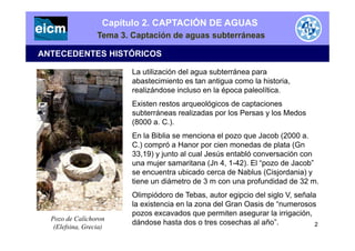 Este documento describe los métodos históricos de captación de aguas subterráneas, incluyendo qanats, pozos, manantiales y sondeos. La captación de aguas subterráneas se remonta a miles de años atrás, con ejemplos en la antigua Persia y en la Biblia. El método del qanat, introducido probablemente en Persia, fue ampliamente utilizado y se expandió a lo largo de las Rutas de la Seda. Otras técnicas como pozos, manantiales y sondeos también se