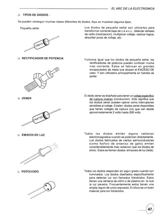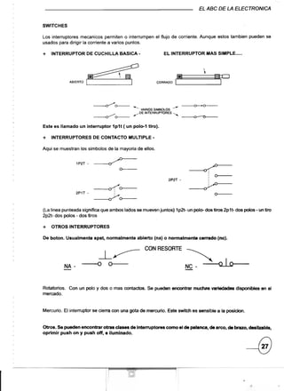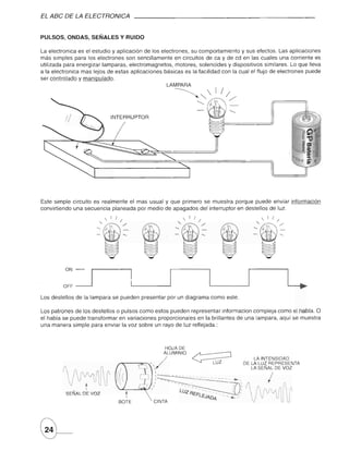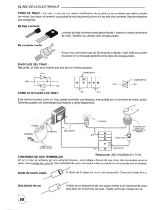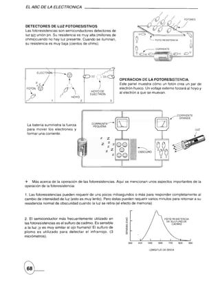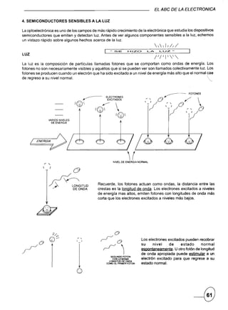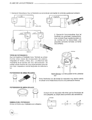 El documento describe diferentes tipos de dispositivos fotoelectrónicos como fotodiodos, fototransistores y fototiristores. Explica cómo se usan los fotodiodos para detección de pulsos infrarrojos y los fototransistores para amplificar señales de luz. También describe los circuitos básicos de fototransistores npn y fotodarlington, así como ejemplos de aplicaciones como encender un relé o zumbador con luz.