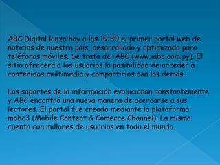 ABC Digital lanza el primer portal de noticias en Paraguay optimizado para teléfonos móviles llamado iABC, que permitirá a los usuarios acceder y compartir contenidos multimedia. El sitio fue desarrollado usando la plataforma mobc3, la cual ofrece contenido adaptado a diferentes dispositivos móviles y tiene millones de usuarios a nivel mundial. El lanzamiento oficial de iABC se realizará en la Expo 2009 donde se demostrará el funcionamiento del nuevo portal.