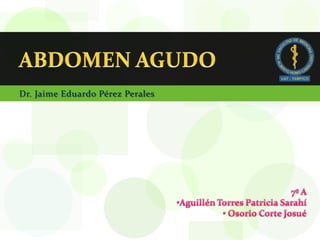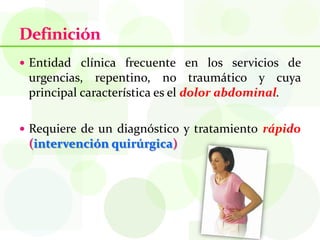 Este documento describe el abdomen agudo, incluyendo su definición, etiología, tipos de dolor, cuadro clínico, exploración física y clasificación. El abdomen agudo es una entidad clínica frecuente que requiere diagnóstico y tratamiento rápidos para prevenir complicaciones graves o la muerte. Puede deberse a una variedad de trastornos gastrointestinales, hepáticos, pancreáticos y otros.
