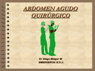 Este documento proporciona información sobre el abdomen agudo quirúrgico. Explica que un abdomen agudo puede ser clínico o quirúrgico, y que los quirúrgicos requieren tratamiento quirúrgico. Detalla signos y síntomas como dolor, vómitos y distensión abdominal que pueden indicar una obstrucción intestinal u otras afecciones abdominales agudas. Recomienda que toda herida penetrante requiere una laparotomía exploradora y que es importante realizar un diagnóstico temprano para tratar con éxito una