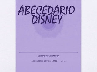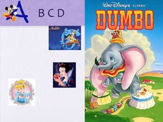El documento presenta un abecedario de personajes de Disney dividido en secciones por letra. Cada sección lista personajes cuyos nombres comienzan con esa letra, con secciones que van de la B a la Z e incluyen personajes como Daniel, Diego, Erika y Martín. Adicionalmente, al final se lista un grupo de personajes cuyos nombres comienzan con letras al final del abecedario como Nayara, Lucía y Quelín.