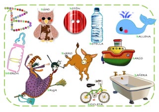 Este documento contiene una lista de objetos y conceptos que comienzan con diferentes letras del alfabeto. Incluye palabras como abrigo, autobús, árbol, avión, bicicleta, casa, coche, dibujo, elefante, flor, guitarra, helado, insecto, jirafa, kiwi, lámpara, manzana, naranja, oso, pelota, queso, reloj, sandía, tarta, uva, velero, woki, xilófono, yate y zapatos.