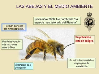 Este documento presenta un resumen de 3 oraciones sobre el proyecto "Salvemos a las abejas" realizado por estudiantes de la Facultad de Ingeniería Química de la BUAP. El proyecto busca crear conciencia sobre la importancia de las abejas como polinizadoras clave y los factores que amenazan su supervivencia como el uso de plaguicidas y la pérdida de hábitat. El documento también describe brevemente el proceso de polinización y algunas medidas para proteger a las abejas.