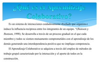 El aprendizaje colaborativo es un sistema diseñado para organizar la influencia mutua entre los miembros de un equipo a través de un proceso gradual donde cada persona se siente comprometida con el aprendizaje de los demás. Se adquiere mediante métodos de trabajo grupal que involucran la interacción y contribución de todos. Tiene objetivos comunes y medibles, motiva a las personas a través de la organización y valora las contribuciones individuales y grupales.