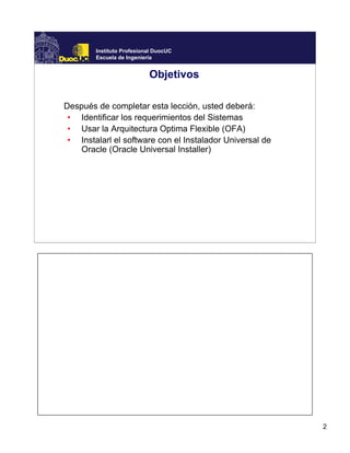 Este documento describe los pasos para instalar Oracle 10g. Explica los requisitos del sistema, la arquitectura flexible óptima (OFA) para planificar la instalación, e instalar el software con el instalador universal de Oracle. Además, cubre temas como variables de entorno, chequeos previos e inventario.