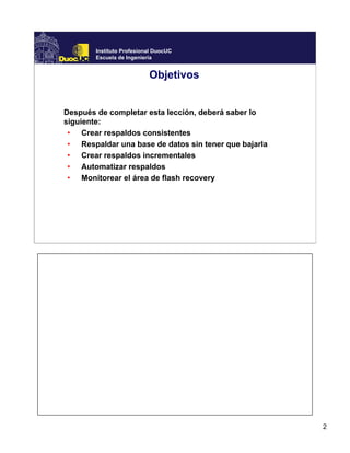 Este documento describe los conceptos y técnicas fundamentales para realizar respaldos de bases de datos Oracle. Explica la terminología clave como respaldos completos, parciales, incrementales y sus diferencias. También describe las herramientas de Oracle como Recovery Manager (RMAN) para automatizar y gestionar respaldos de manera eficiente. Por último, detalla los pasos para configurar las políticas y programar respaldos usando la interfaz gráfica de Enterprise Manager.