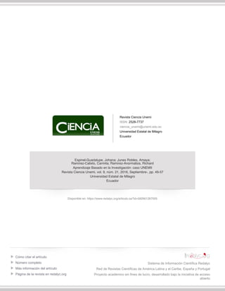 Este documento analiza la implementación del aprendizaje basado en la investigación (ABI) en la Universidad Estatal de Milagro (UNEMI) en Ecuador. Presenta datos de una investigación con 304 estudiantes que muestra que el uso del ABI por parte de los profesores está relacionado con un aumento en el uso de documentos científicos por los estudiantes y una mayor producción científica de los profesores. Concluye que el ABI es una estrategia efectiva para mejorar la enseñanza y el aprendizaje en la universidad.