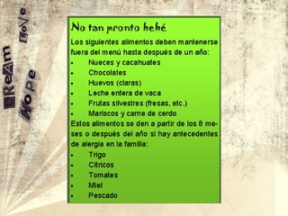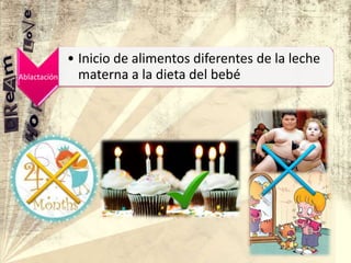 Este documento habla sobre la ablactación, que es el proceso de introducir alimentos sólidos a la dieta del bebé además de la leche materna. Explica que la ablactación tiene como objetivo que la nutrición del bebé pase gradualmente a basarse en alimentos sólidos. También proporciona recomendaciones sobre cómo hacer la transición a los sólidos de una manera cómoda y agradable para el bebé, como dar un solo alimento nuevo cada pocos días y asegurarse de que el entorno sea adecuado