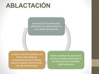 El documento habla sobre la ablactación o introducción de alimentos diferentes a la leche materna en la dieta del lactante. Recomienda introducir alimentos sólidos entre los 4 y 6 meses de edad, y leche de vaca después de los 12 meses. Explica los factores a considerar como el desarrollo neurológico, gastrointestinal y renal del lactante, así como la producción de leche materna y factores inmunológicos, socioeconómicos y culturales.