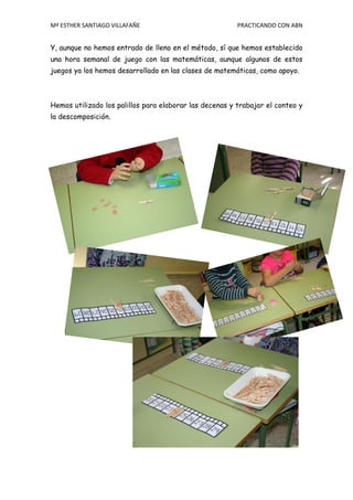 Esther Santiago está practicando el método ABN en su clase de segundo grado. Ha creado varios juegos y materiales manipulables como barajas de números, fichas y tableros para que sus alumnos practiquen la numeración, descomposición de números, operaciones básicas y más conceptos matemáticos de una manera lúdica. Aunque todavía no ha introducido plenamente el método, ha establecido una hora semanal para jugar con las matemáticas y espera poder enseñar operaciones del método ABN en el