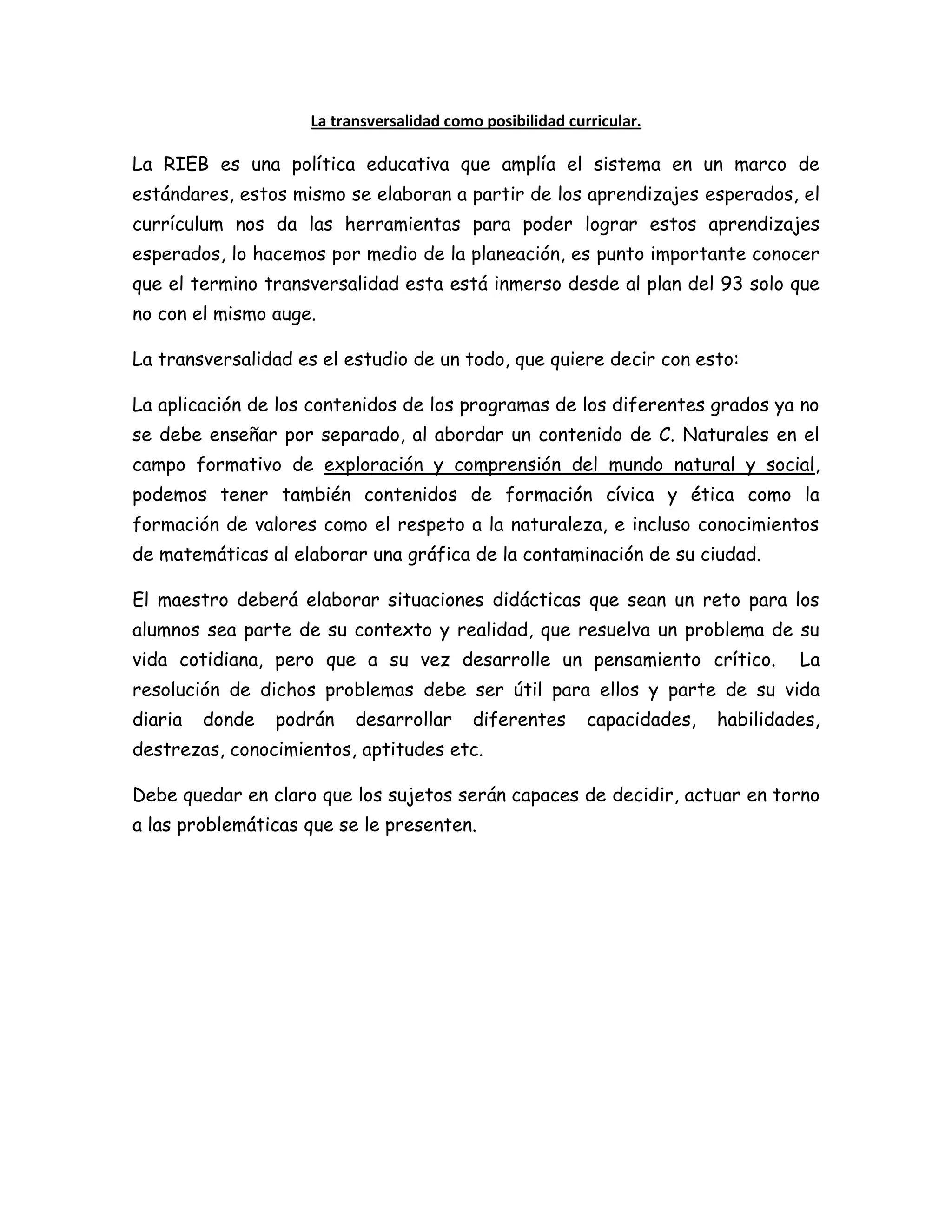 La transversalidad curricular implica enseñar los contenidos de diferentes asignaturas de manera integrada y vinculada al contexto y realidad de los estudiantes. Los maestros deben planear situaciones didácticas que supongan un reto y resuelvan problemas cotidianos de los alumnos, desarrollando un pensamiento crítico y capacidades que les sean útiles en la vida diaria. El objetivo es que los estudiantes puedan tomar decisiones informadas sobre las problemáticas que enfrentan.
