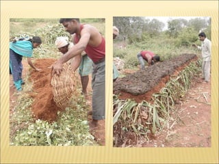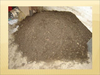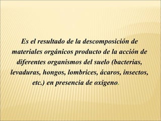 El compost y el humus de lombriz son abonos orgánicos que se producen de forma natural a través de la descomposición de materiales orgánicos por microorganismos y lombrices respectivamente. El compost se puede hacer de manera casera con desechos orgánicos y el humus de lombriz se obtiene del proceso de descomposición realizado por lombrices rojas californianas. Ambos son fertilizantes ricos en nutrientes que mejoran la estructura y fertilidad del suelo.